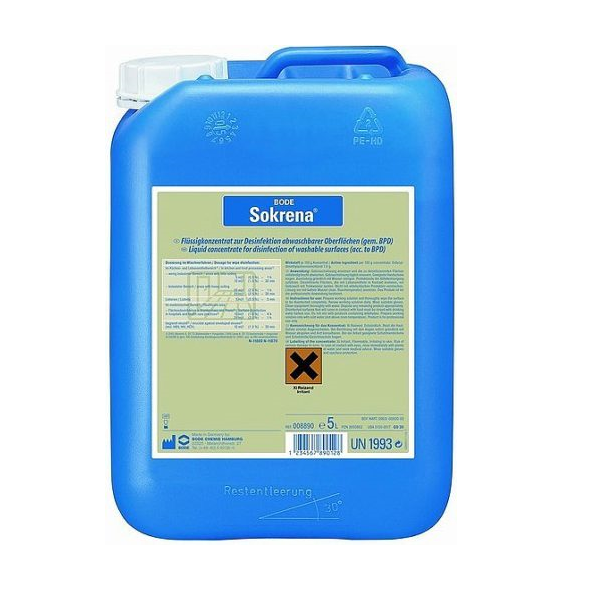 SOKRENA 5L ir koncentrēts šķidrums mazgājamo virsmu dezinfekcijai. SOKRENA ir piemērota visu veidu pārtikas pārstrādes rūpniecību, ēdnīcu zonu, inventāra, viesnīcu virtuvju, farmācijas nodaļu, ierīču, uzglabāšanas iekārtu dezinfekcijai. SOKRENA nogalina baktērijas, sēnītes, vīrusus un nesatur aldehīdus.