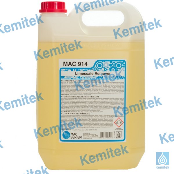 MAC 914 ir skābs produkts, kuru lieto kaļķakmens nogulšņu un rūsas attīrīšanai no dažādām skābi izturīgām virsmām, tādām, kā flīzes, nerūsējošā tērauda virsmas, plastmasas utt. Produktu var pielietot, lai efektīvi attīrītu kafijas pagatavošanas aparātus, tējkannas, trauku mazgāšanas mašīnas, tvaika ģeneratorus utt. no kaļķakmens un rūsas nogulsnēm. Dozēšana: atkarībā no netīrības pakāpes pielietot tīru vai atšķaidītu ar ūdeni - 250ml uz 750ml ūdens.