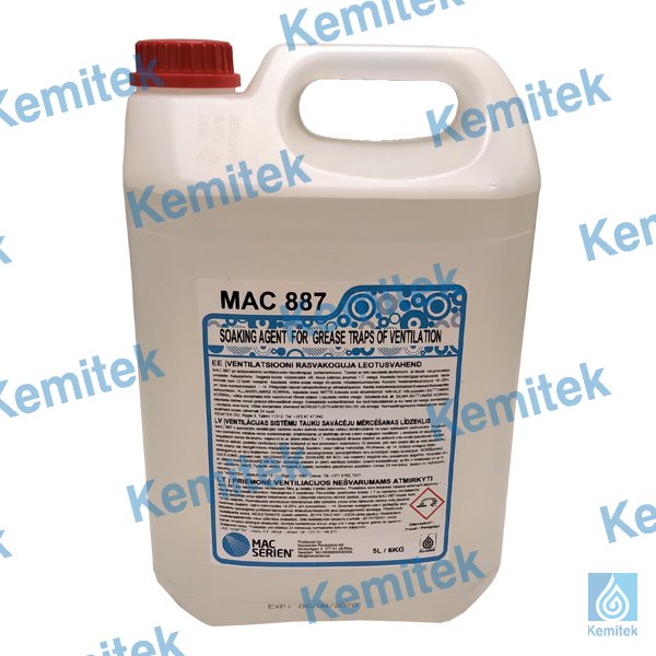 MAC 887 ir paredzēts ventilācijas sistēmu tauku, putekļu savāceju (ieliku) atmērcēšanai no stipri ieēdušiem netīrumiem. Produkts nav piemērots nekāda veida pielietošanai, izmantošanai uz alumīnija vai citiem vieglajiem metāliem. Lietošana: sagatavot darba šķidrumu sajaucot to ar ūdeni 1:7 nerūsējošā tērauda izlietnē vai jebkurā cita veida piemērotā tvertnē. Iemērkt ielikas (putekļu savācējus) darba šķīdumā un ļaut produktam iedarboties 12 stundas, pēc tam skalot tās ar lielu daudzumu silta ūdens vai mazgāt trauku mazgājamā mašīnā.