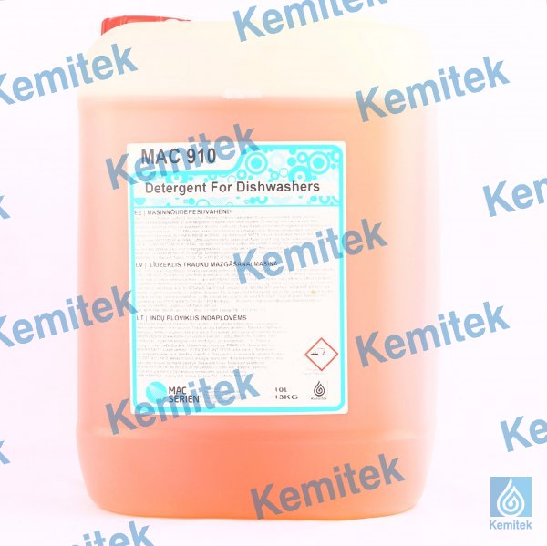 MAC 910 ir līdzeklis trauku mazgāšanai visa veida profesionālās trauku mazgājamās mašīnās. Pielietojams ūdenī ar dažādu cietību. Produkts nav piemērojams alumīnija un citu vieglo metālu trauku mazgāšanai.Do­­zēšana:atkarība no trauku tipa un ūdens cietības pkāpes-caur automātisko dozēšanas iekārtu.