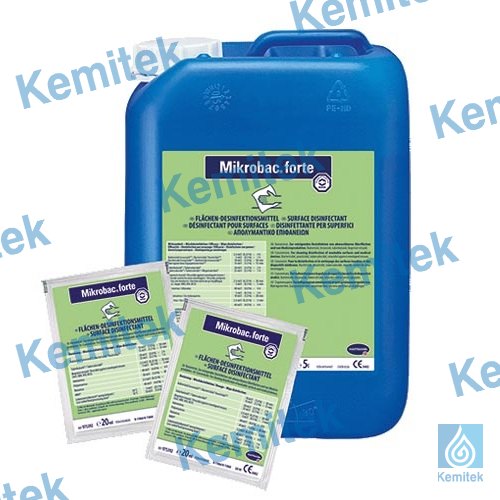 MIKROBAC FORTE 5L ir koncentrēts šķidrums ūdens izturīgu un mazgājamu virsmu mazgāšanai - dezinfekcijai. MIKROBAC FORTE ir piemērota visu veidu pārtikas pārstrādes rūpniecību, ēdnīcu zonu, inventāra, viesnīcu virtuvju, farmācijas nodaļu, ierīču, uzglabāšanas iekārtu u.c. ūdens izturīgu virsmu mazgāšanai - dezinfekcijai. MIKROBAC FORTE efektīvi cīnās un iznīcina baktērijas, sēnītes, vīrusus un nesatur aldehīdus.